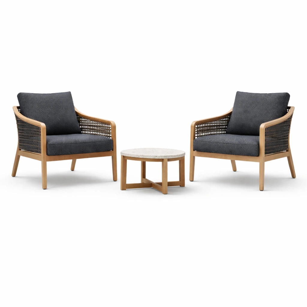 Set da giardino con poltrone in legno e tavolino rotondo in marmo