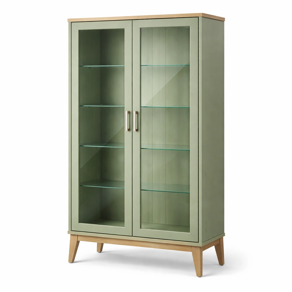Vetrina in legno e vetro temperato verde con ripiani regolabili
