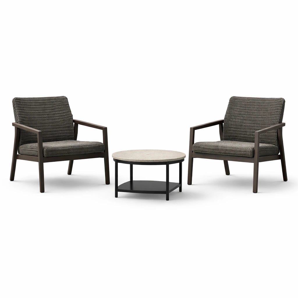 Il set comprende due sedie e un tavolino. Le sedie sono realizzate con una struttura in alluminio e seduta in rattan sintetico. Il tavolino ha un piano in ceramica e struttura in acciaio. Adatto per ambienti esterni grazie alla resistenza all'acqua e ai raggi UV.